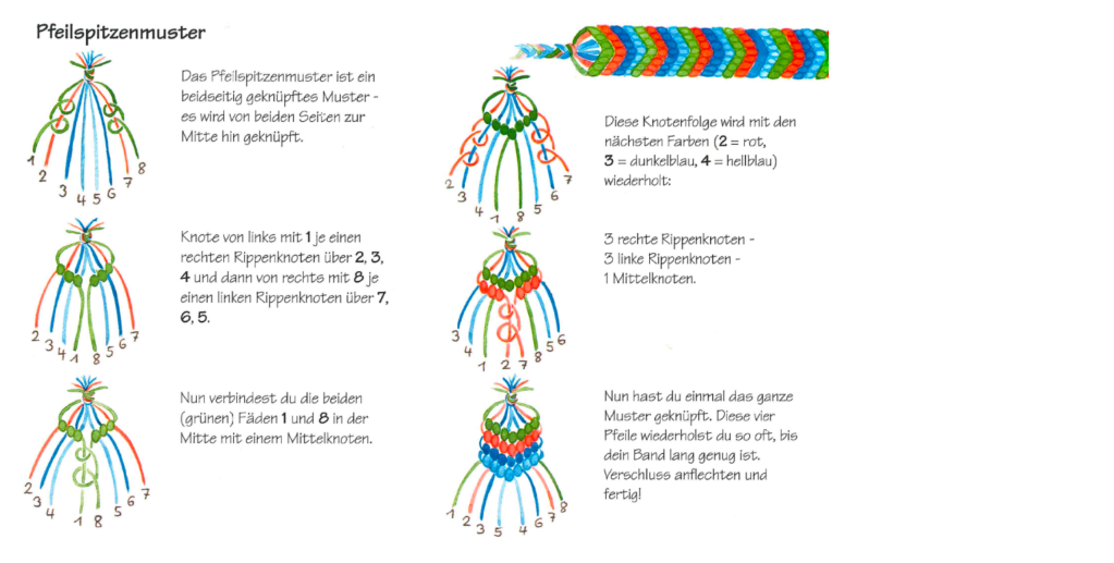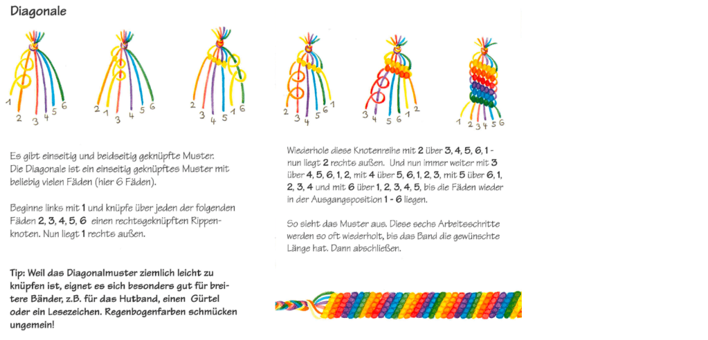 Ihr findet das gesamte Material (Fäden und Sicherheitsnadel), was ihr für das Knüpfen eines Armbandes benötigt, in dem Paket. Für diejenigen von euch, die noch etwas Hilfe benötigen oder ein neues Muster ausprobieren möchten, haben wir Anleitungen zusammengestellt, die euch hoffentlich weiterhelfen. Natürlich findet ihr auf YouTube diverse Videos, die euch zusätzlich helfen können. Wir wünschen euch viel Spass beim Knüpfen!