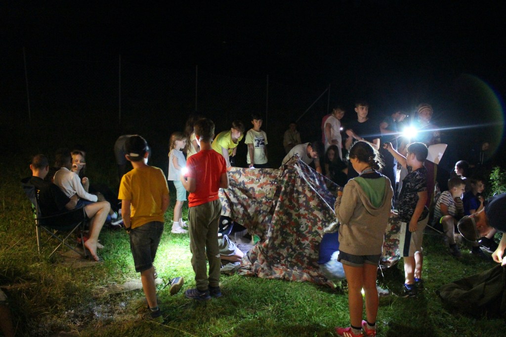 Die Omeletten am Abendessen waren der Hit. Anschliessend begann das Abendprogramm mit Klein gegen Gross. Bei diesem Spiel kämpfen die Kinder in Wettkämpfen gegen die leitenden Personen. Zuerst wurden mini Challenges absolviert in Form von blind Schokoküsse füttern oder gegeneinander singen.