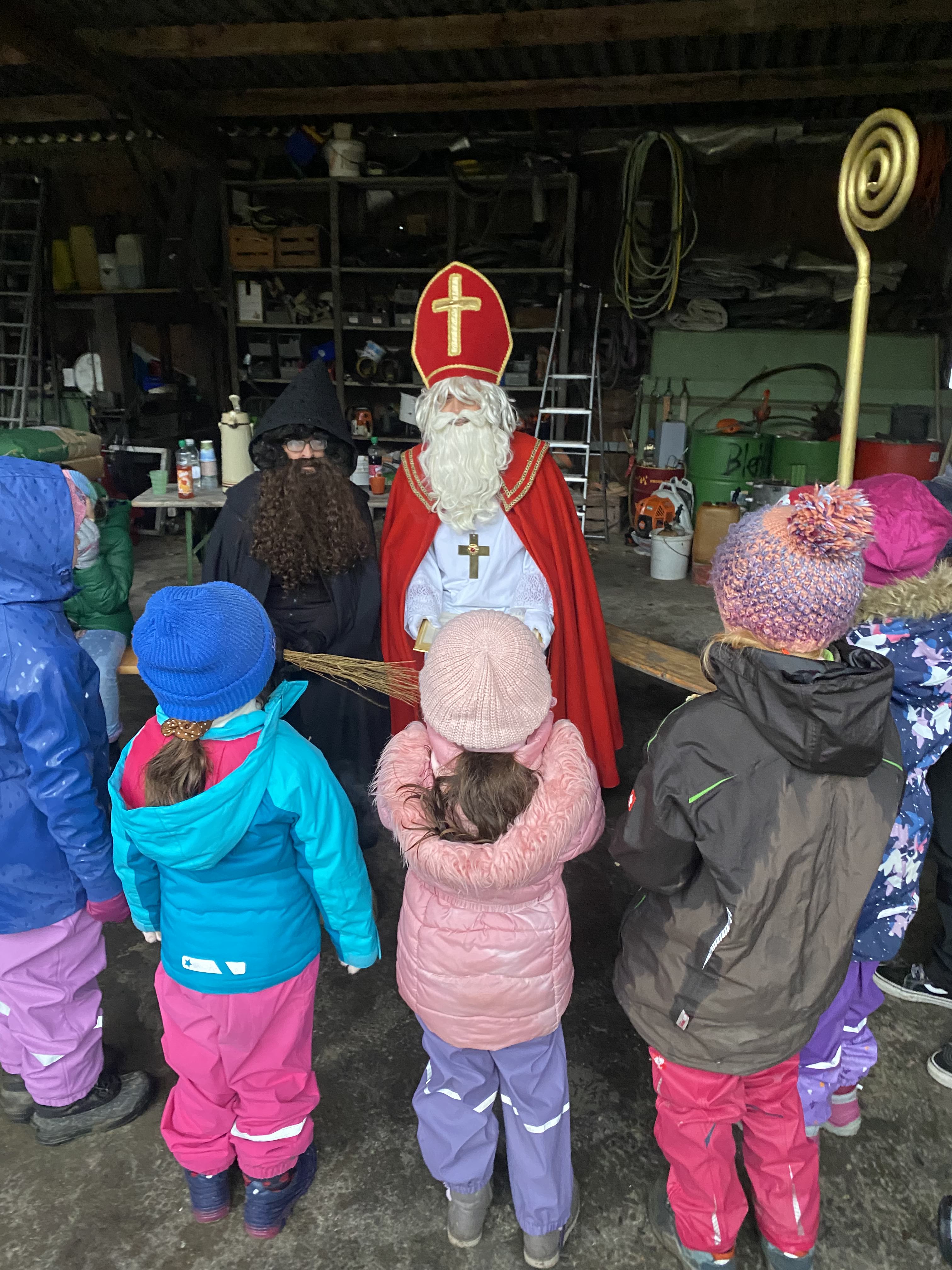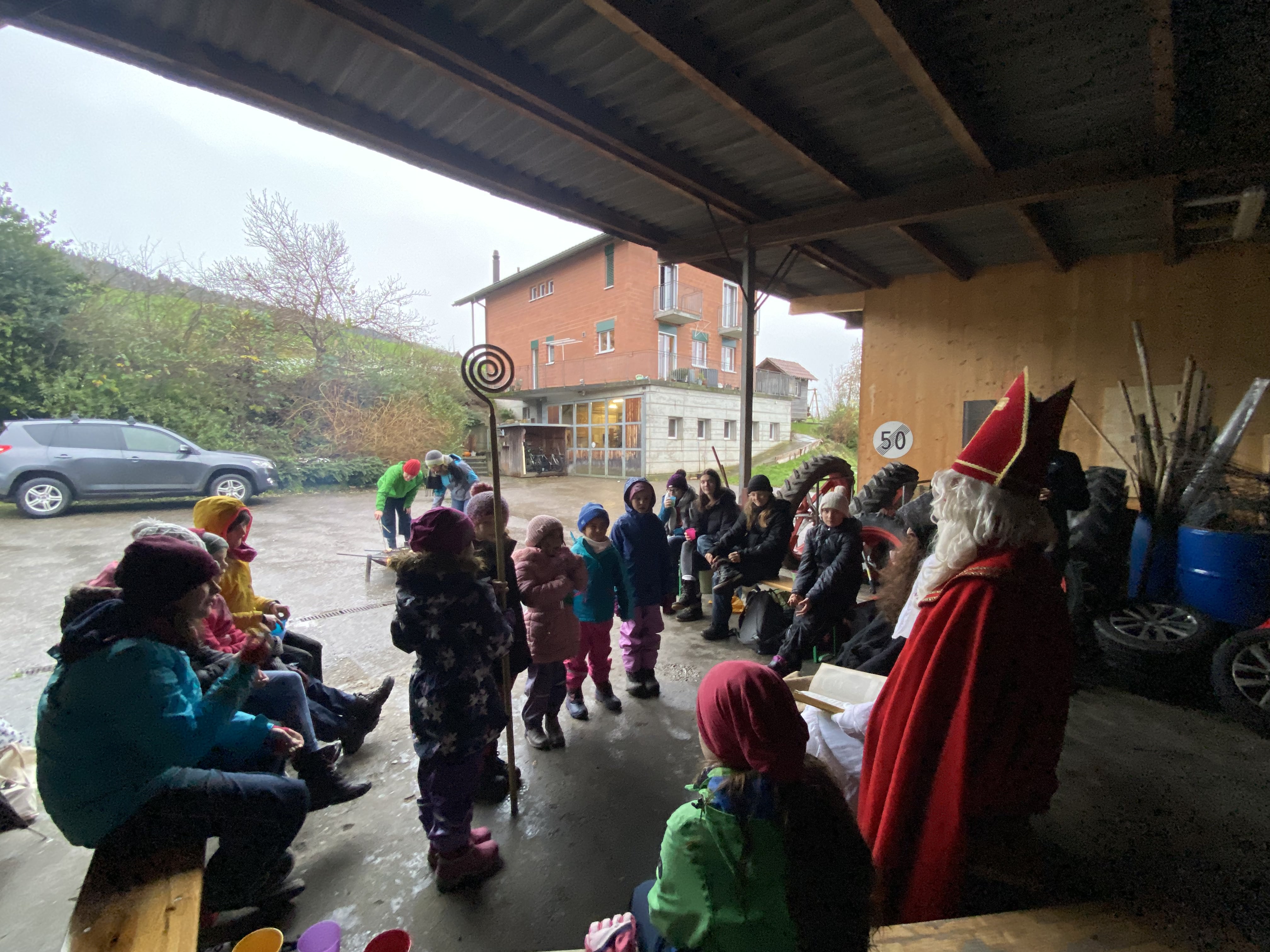 selbstgemachten Schlangenbrotteig, tranken heissen Punsch, sangen Winter- und Weihnachtslieder und warteten gespannt auf den Samichlaus und seinen Gehilfen. Schon bald konnten wir das Glöckchen hören. Da war der Samichlaus und der Schmutzli bepackt mit einem schweren Sack und dem goldenen Buch. Über jedes Kind und alle Leitenden hatte der Samichlaus etwas zu erzählen, aber viel schimpfen musste er nicht. Da die meisten auch ein Sprüchli konnten, übergab der Schmutzli jedem ein Säckli, gefüllt mit Erdnüssen, Mandarinen, Guetzli und Schokolade. Dann mussten der Samichlaus und der Schmutzli leider auch schon weiter, weil noch viele andere Kinder aufgeregt auf ihren Besuch warteten.