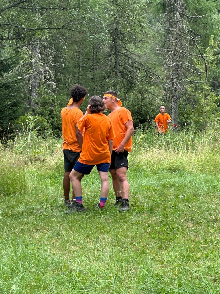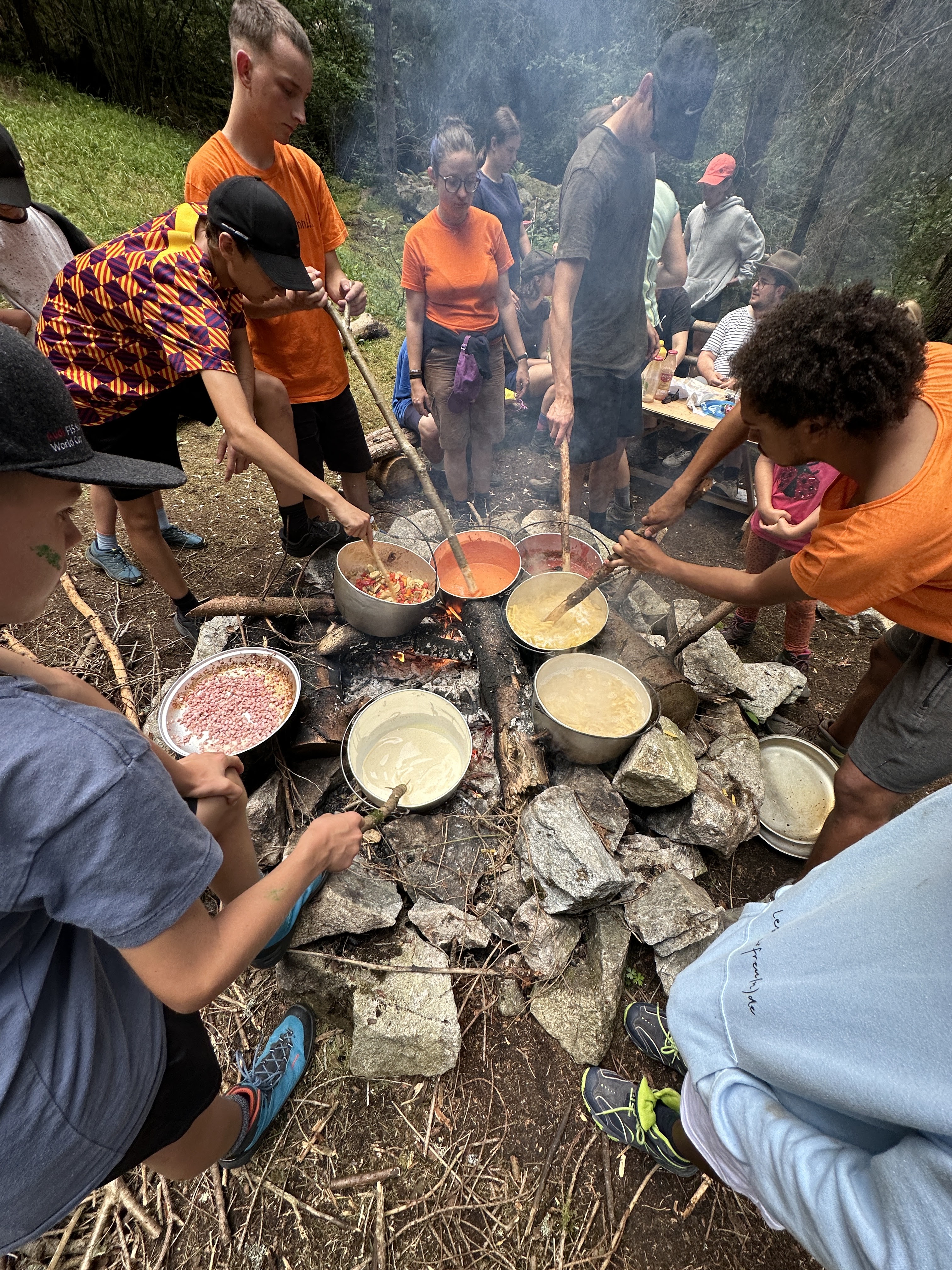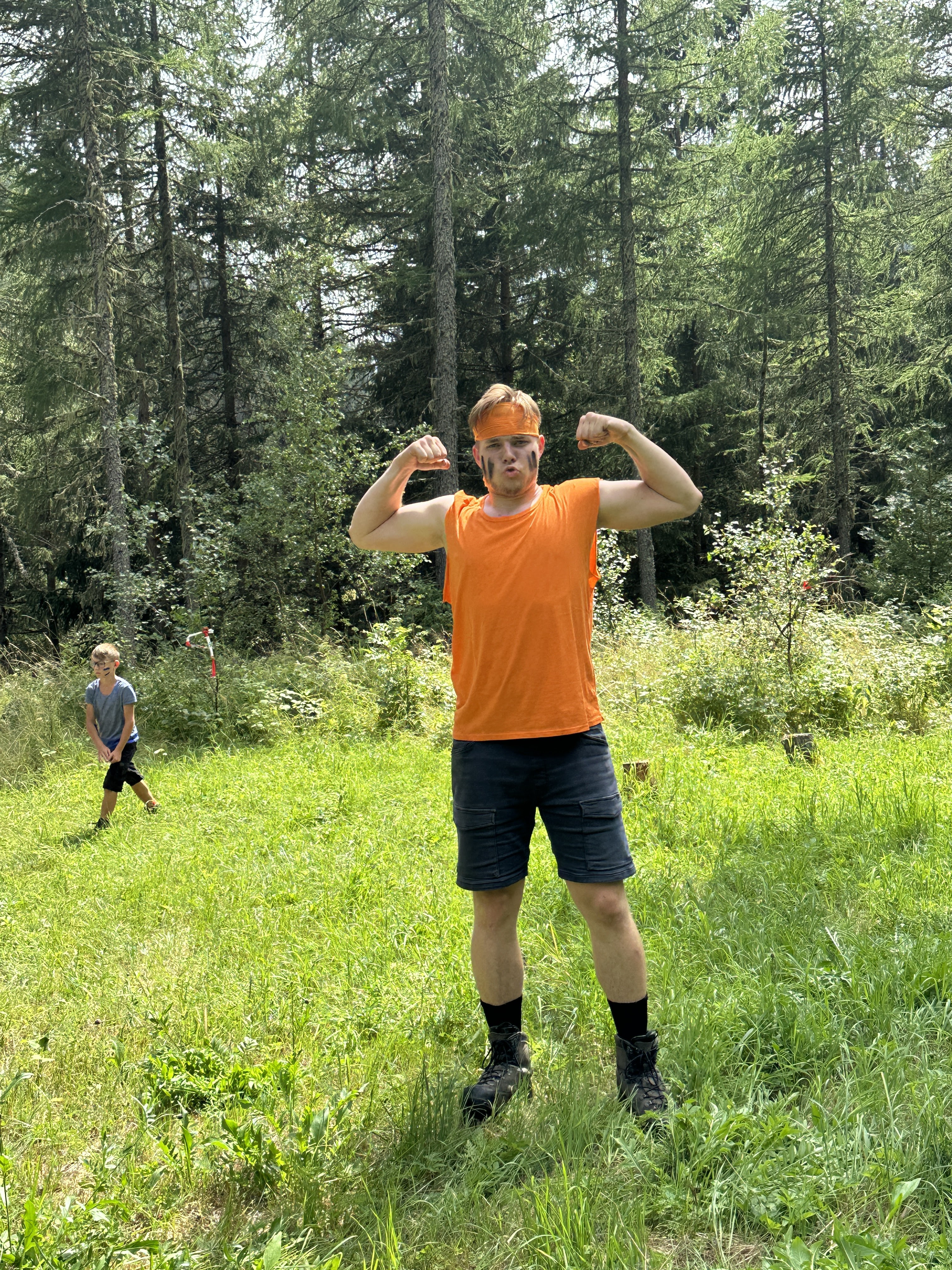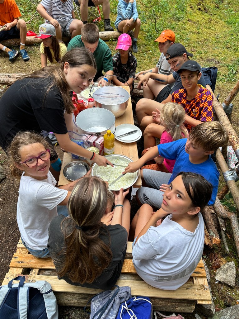 Heute war der erste Tag im Element Feuer. Am Morgen standen demnach die Gefahren und der Umgang mit Feuer im Zentrum. In Gruppen hat die ganze Schar gelernt, wie man ein Feuer macht, wie man mit einer Verbrennung umgeht, was man sagen muss, wenn man die Feuerwehr anrufen muss und noch vieles mehr. Zum Abschluss von diesem lehrreichen Morgen haben die Gruppen noch ihre eigene Technik zum Feuer machen vorgestellt. So lernten die Kinder zusätzlich wie man z.B. mit Feuerbohrer, Feuerstahl oder auch einer Batterie ein Feuer machen kann. Nach einem stärkendem Mittagessen und einer Erholungspause ging es an das erste grössere Geländespiel des Lagers. Vier Gruppen versuchten Zutaten zu ergattern, um später die beste Pastasauce der Schar zu kochen. Bei diesem sportlichen Nachmittag war der volle Einsatz von allen gefragt. Alle haben wie erhofft vollen Einsatz geleistet. Als alle Gruppen die nötigen Zutaten beisammen hatten, gingen wir zu einer Feuerstelle und begannen kurz danach zu kochen. Während einige Feuer machten wurde fleissig an den Pastasaucen gearbeitet. Zum Abendessen sassen alle zusammen und haben Pasta mit den gekochten Saucen gegessen. Zum Schluss wurde die beste Sauce noch gekürt. Nach einem abrupten Ende aufgrund vom starkem Regen und nach einer heissen Dusche durften die Kinder dann noch ein leckeres Dessert im Lagerhaus geniessen. So ging der erste Tag im Element Feuer zu ende und alle konnten glücklich und mit vollem Magen schlafen gehen.