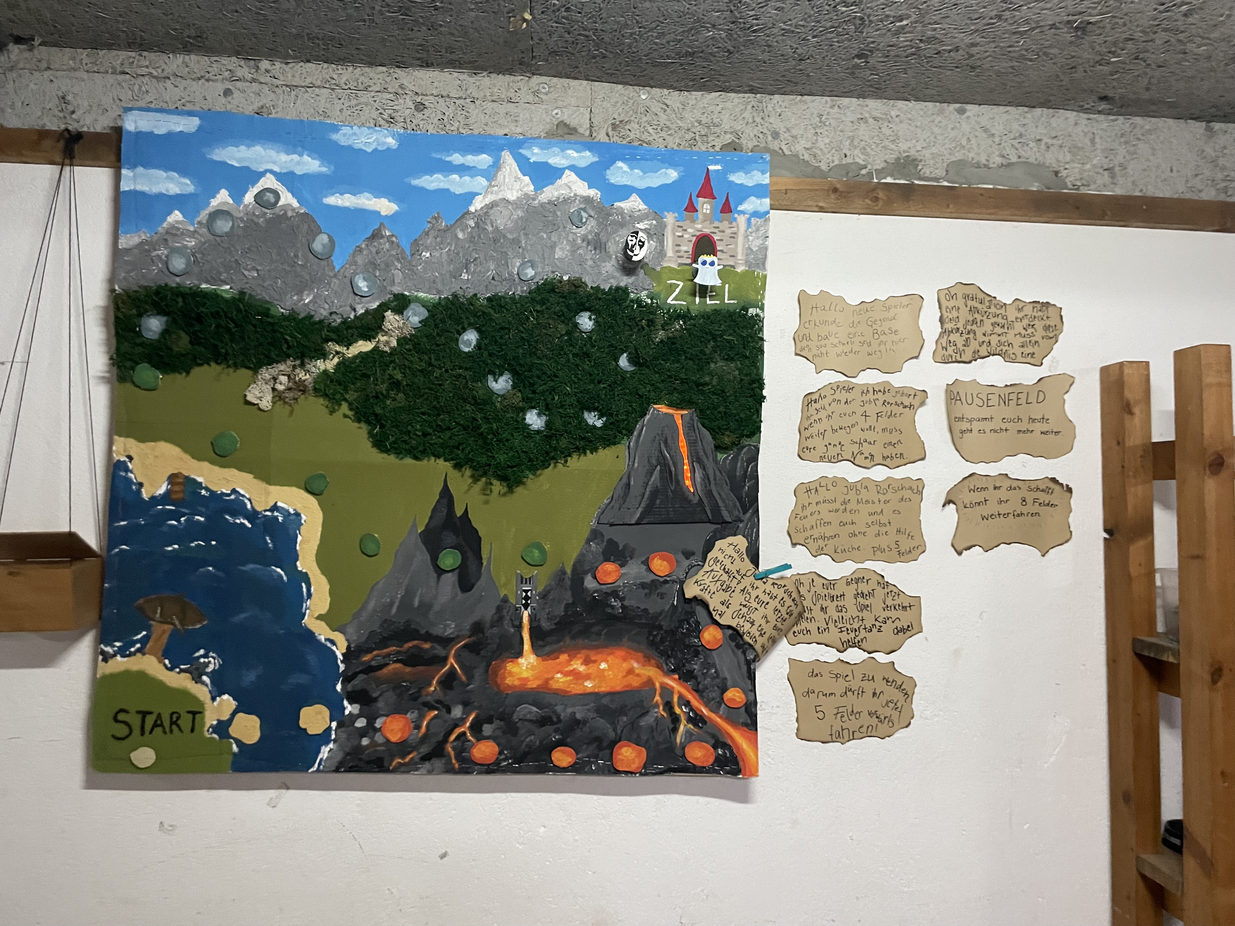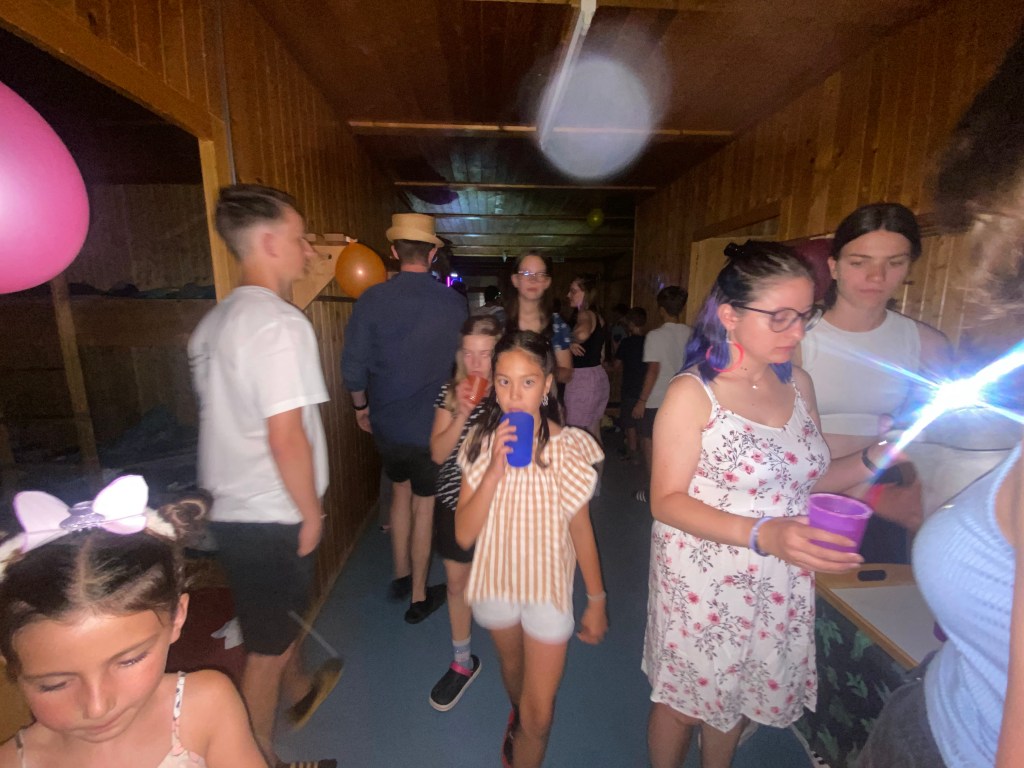 Zum Abschluss des Lagers mussten die Kinder einen aetzten Sportparkour absolvieren. Sie mussten an mehreren Posten verschiedene Disziplinen, die mit unserem Letzen Level «Luft» zu tun haben ihr können beweisen. Sie mussten zum Beispiel einen Ballon ohne Hände über eine Strecke transportieren oder ein Wattebällchen mit nur dem eigenen Atem über einen Tischtennistisch befördern. Am Nachmittag mussten die Kinder noch lernen wie man sich selbst versorgen kann, falls sie sich mal eine Verletzung zuziehen und niemand ihnen helfen kann. Sie wissen nun, wie man Verbrennungen einschätzt und behandelt oder auch wie ein Druckverband funktioniert. Mit diesen zwei letzten Programmen durften die Kinder die letzten zwei Spielfelder fahren und somit Tarabas einholen und ins Ziel gekangen. Die Kinder dürfen nun als Sieg gegenüber Tarabas und fürs wieder eintreten in die echte Welt eine riesige Party in form vom bunten Abend machen. Dort wurde mit lauter Musik und vielen Jubla Tänzen wie der Fersenspitze- Tanz oder der Spaghetti-Tanz und mit leckeren Getränken gefeiert. Die Kinder gingen dann müde, aber überglücklich ins Bett. Einige von ihnen sind bereits schon zufrieden während dem bunten Abend eingeschlafen, obwohl die Musik laut aufgedreht war.