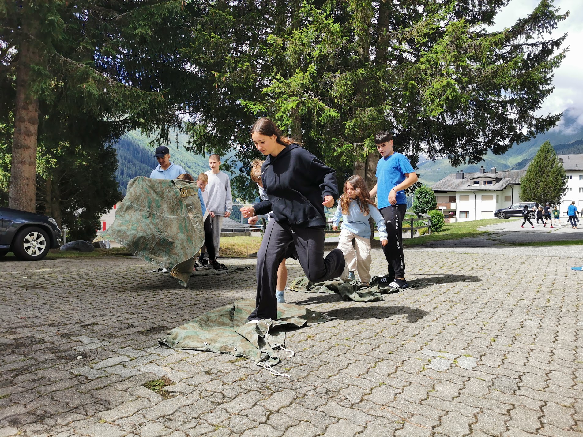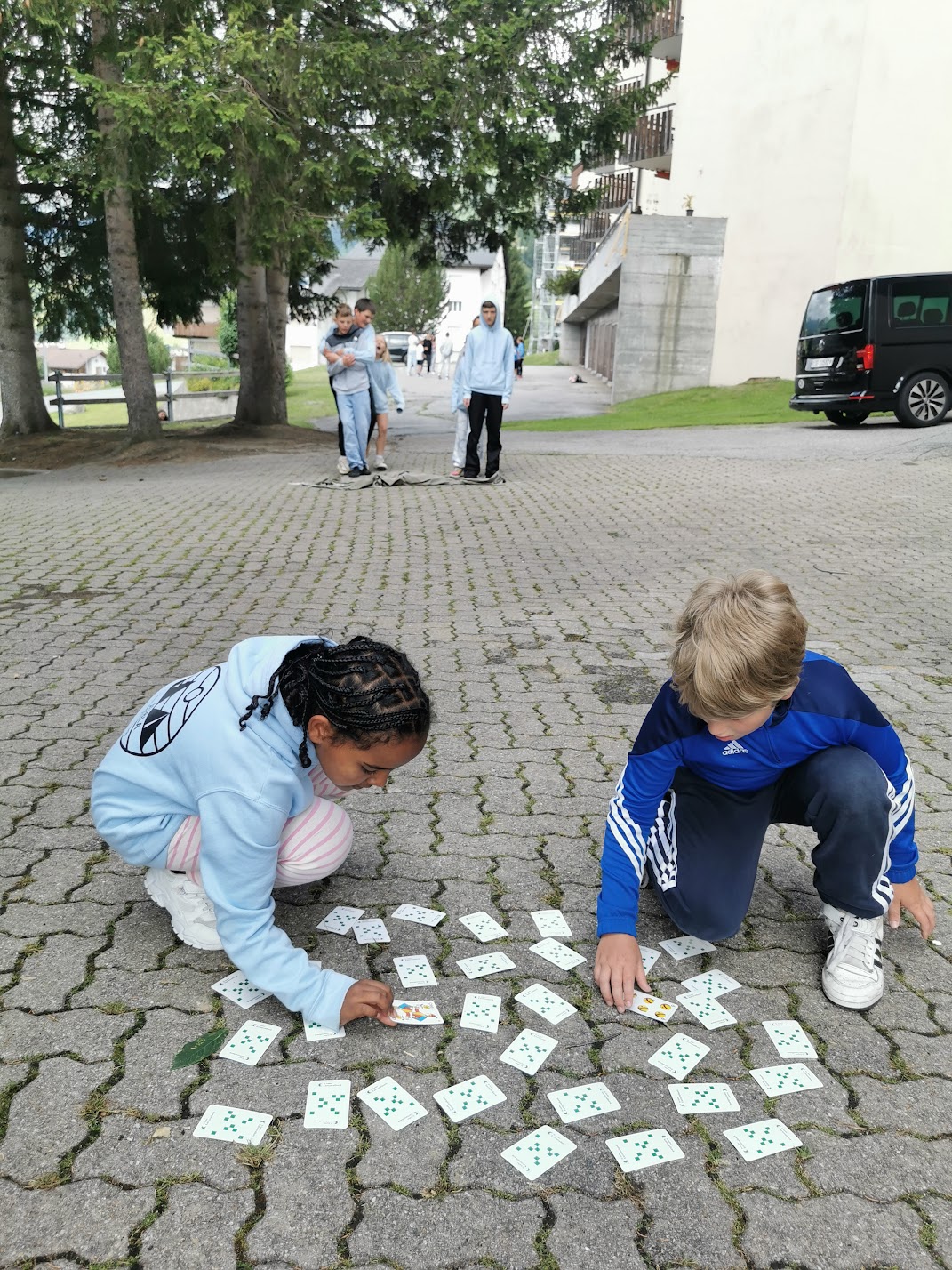 Heute starteten die Kinder mit einem Sportmorgen in den Tag. Sie müssen schliesslich fit werden, um den Täter verfolgen zu können. Dabei wurde die Beweglichkeit beim Yoga, das Rhythmusgefühl beim Tanzen und die Schnelligkeit bei den Stafetten verbessert. Die Kinder haben vollen Einsatz gezeigt, wie auf den Bildern ersichtlich ist.