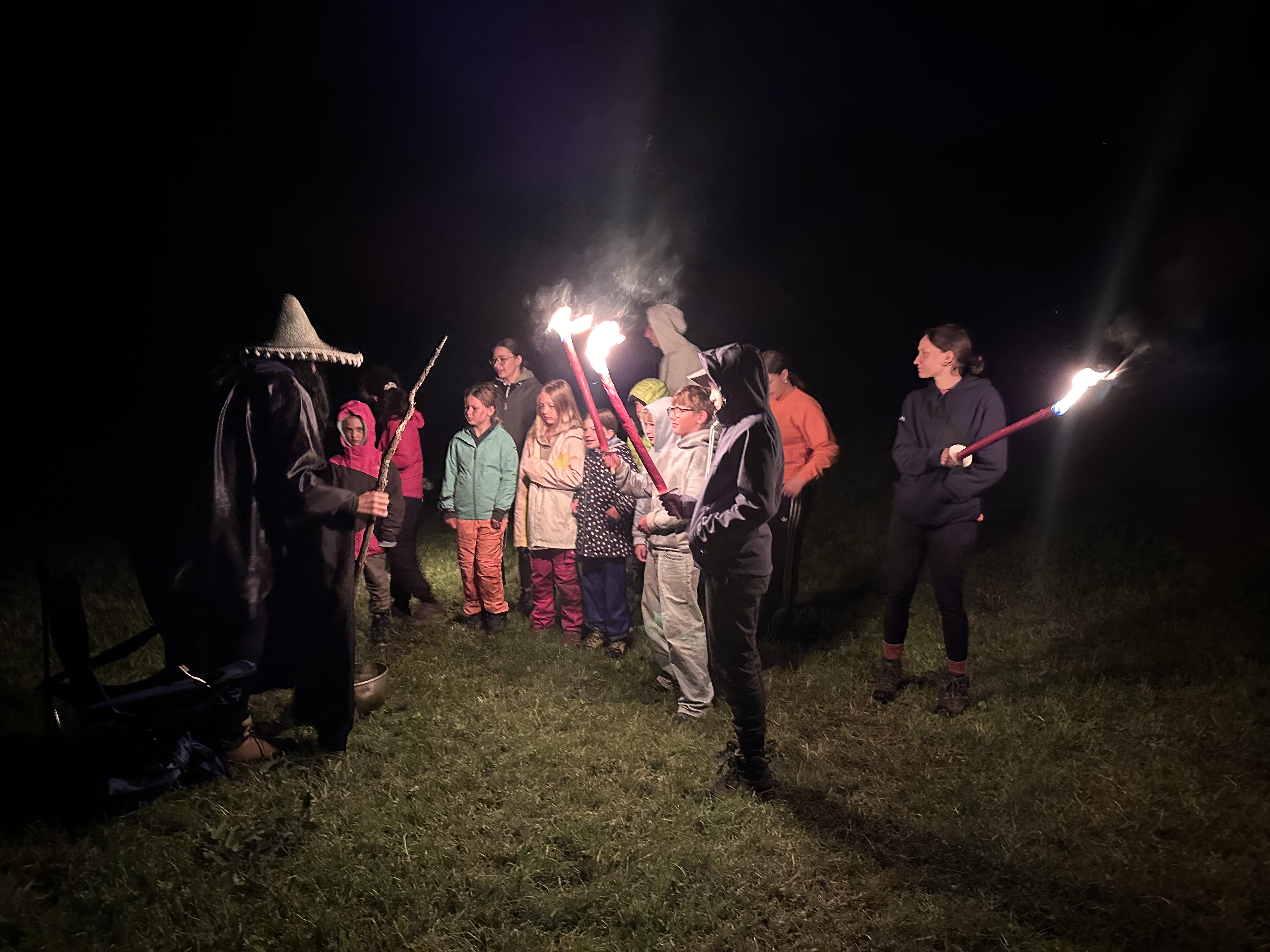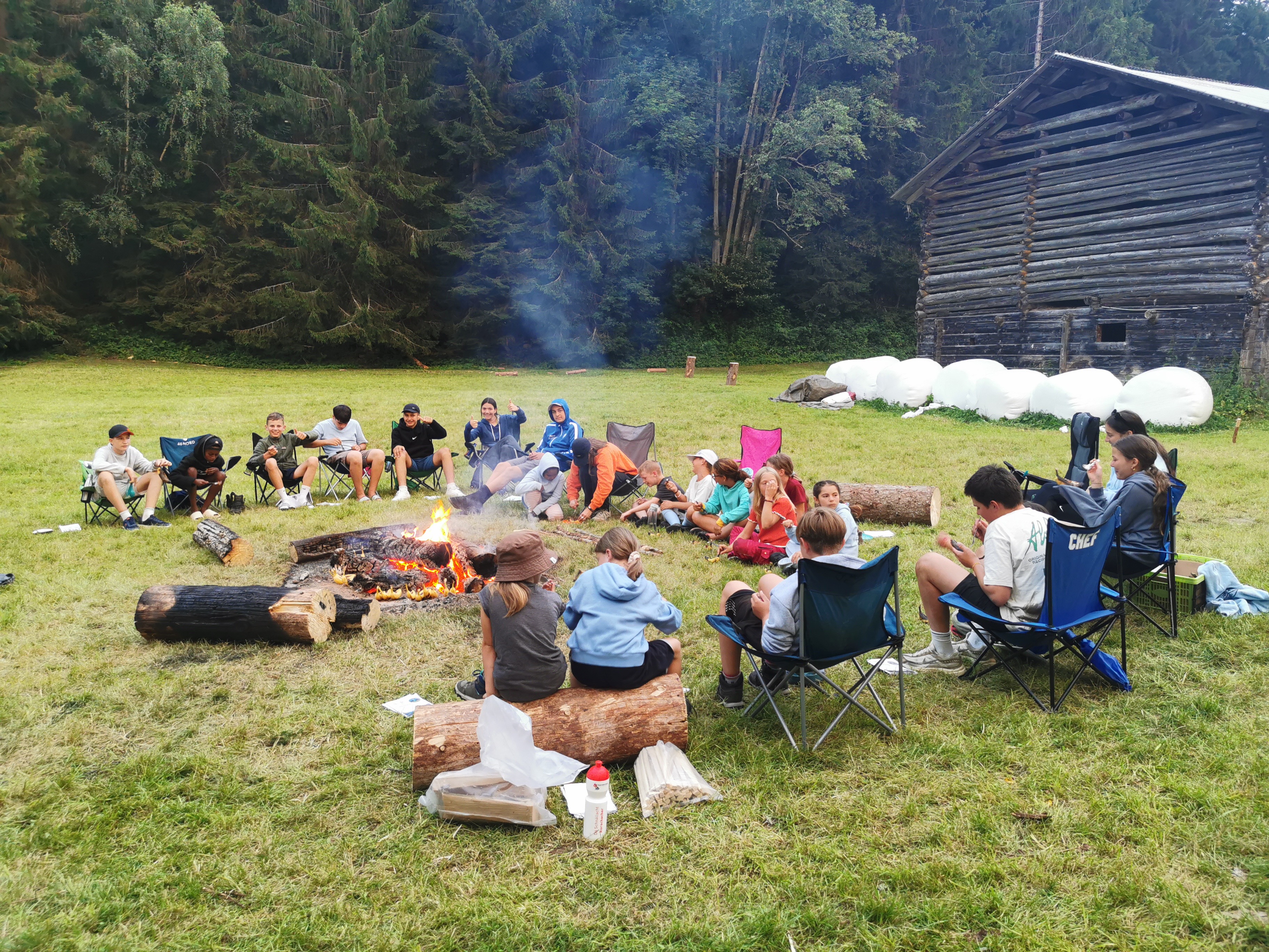 Am Freitag, kurz nach dem Morgenessen erzählte die aufgebrachte und verwirrte Polizistin Iusa den Kindern, dass Peter seit dem Dorffest spurlos verschwunden ist. Also machten wir uns auf den Weg zum Dorffestplatz. Die Wanderung war streng und angstüberwindend, aber die jungen Detektive meisterten sie mit Bravour. Beim Platz angekommen, mussten wir erst unsere Zelter aufbauen, da wir mehrere Tage für die Ermittlung brauchen würden. Nachdem die Zelter standen, hatten die Kinder Zeit kreativ zu sein und weitere Dinge auf dem Platz aufzustellen. Es wurde eine Outdoortoilette, ein Fussballfeld, ein Sonnensegel und ein Lagerfeuer inklusive Küche gebaut. Nach dem Abendessen liessen wir den Abend am Lagerfeuer mit gemeinsamen Liedersingen ausklingen.